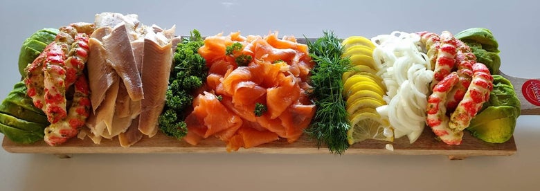 * Gerookte zalm met verse ui, citroen, kruiden en avocado.